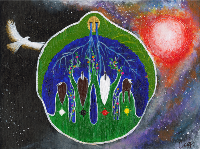“We are one – we are connected to everything. This is how we heal, knowing we are connected to everything – connected to the land, to the water, to the air, to all beings. We pray to Ihtsipaitapiiyo’pa, the Source of all Life. We sit in ceremony with Ihtsipaitapiiyo’pa and our grandmothers and grandfathers, the ancestors and the ancients. When we pray, we align mind, body, and spirit. As we pray, align and connect, we model ways of knowing and being for our children. There has been much destruction, oppression and intentional disregard of our traditional ways. This is why She cries, there is considerable healing to be done and this will occur once we acknowledge and feel the pain and trauma – we will survive, overcome, and reconcile, this is Kaamotaan. We also grieve – the loss of our land, of our culture, of our language. Only when it rains can we cleanse and blossom as we move forward with the ancestral knowledge and ways of knowing and being. We heal for our survivors; we heal for our children; we heal for the seven generations before us and the seven generations to come after us. We are one.”